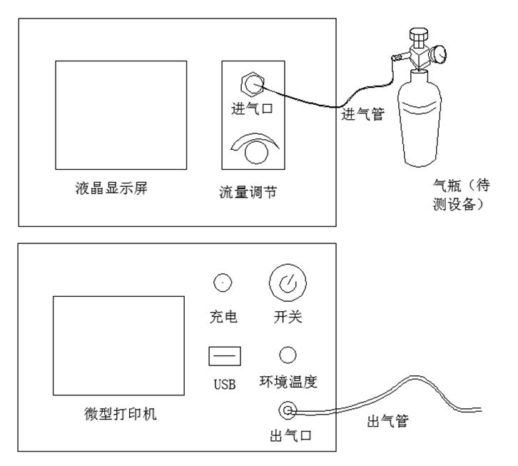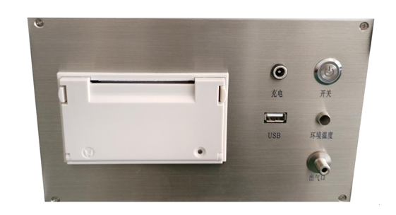 背面由充電口、開關鍵、USB接口、環境溫度、出氣口、微型針式打印機組成。