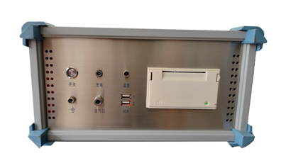 后面板由開關、出氣口、USB插口、微型打印機、環(huán)境溫濕度、充電口、接地端組成