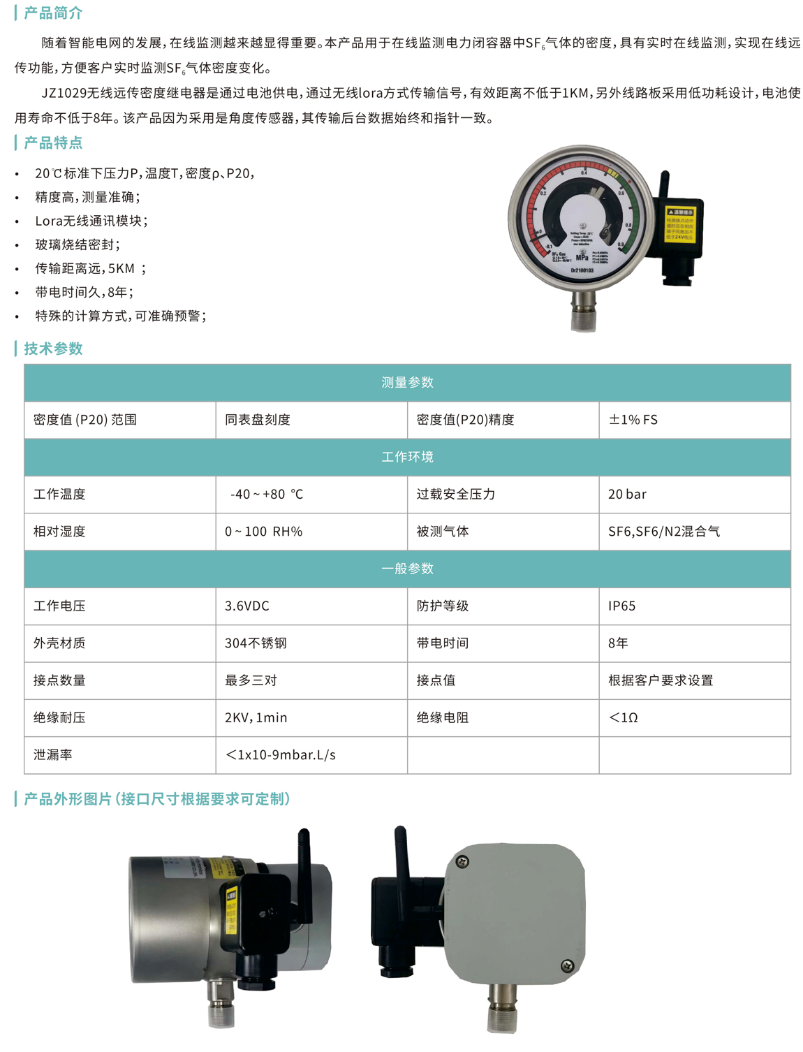 隨著智能電網的發展,在線監測越來越顯得重要。本產品用于在線監測電力閉容器中SF6氣體的密度,具有實時在線監測,實現在線遠傳功能,方便客戶實時監測SF6氣體密度變化。 JZ1029無線遠傳密度繼電器是通過電池供電,通過無線or方式傳輸信號,有效距離不低于1KM,另外線路板采用低功耗設計,電池使用壽命不低于8年。該產品因為采用是角度傳感器,其傳輸后臺數據始終和指針一致。