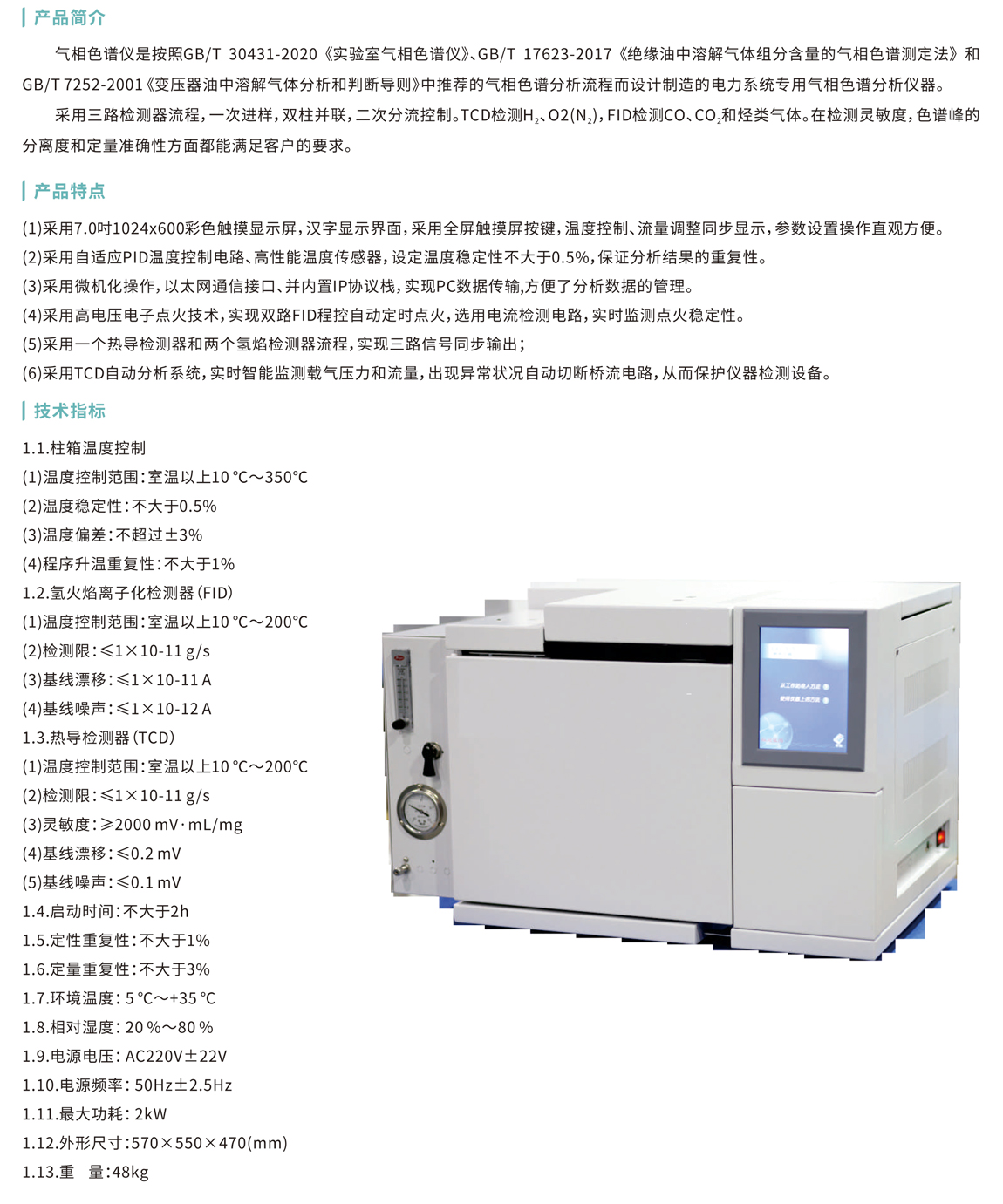 氣相色譜儀是按照GB/T30431-2020《實驗室氣相色譜儀》、GB/T17623-2017《絕緣油中溶解氣體組分含量的氣相色譜測定法》和 GB/T7252-2001《變壓器油中溶解氣體分析和判斷導則》中推薦的氣相色譜分析流程而設計制造的電力系統專用氣相色譜分析儀器。