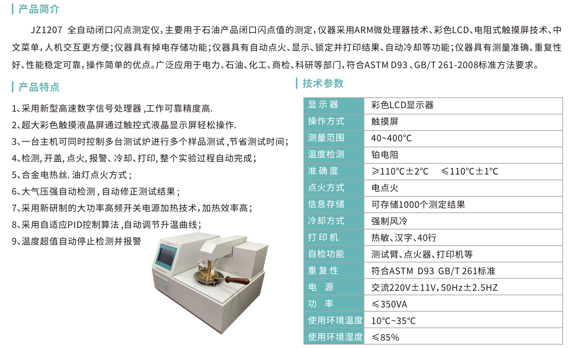 JZ1207全自動閉口閃點測定儀,主要用于石油產(chǎn)品閉口閃點值的測定,儀器采用ARM微處理器技術(shù)、彩色LCD、電阻式觸摸屏技術(shù)、中