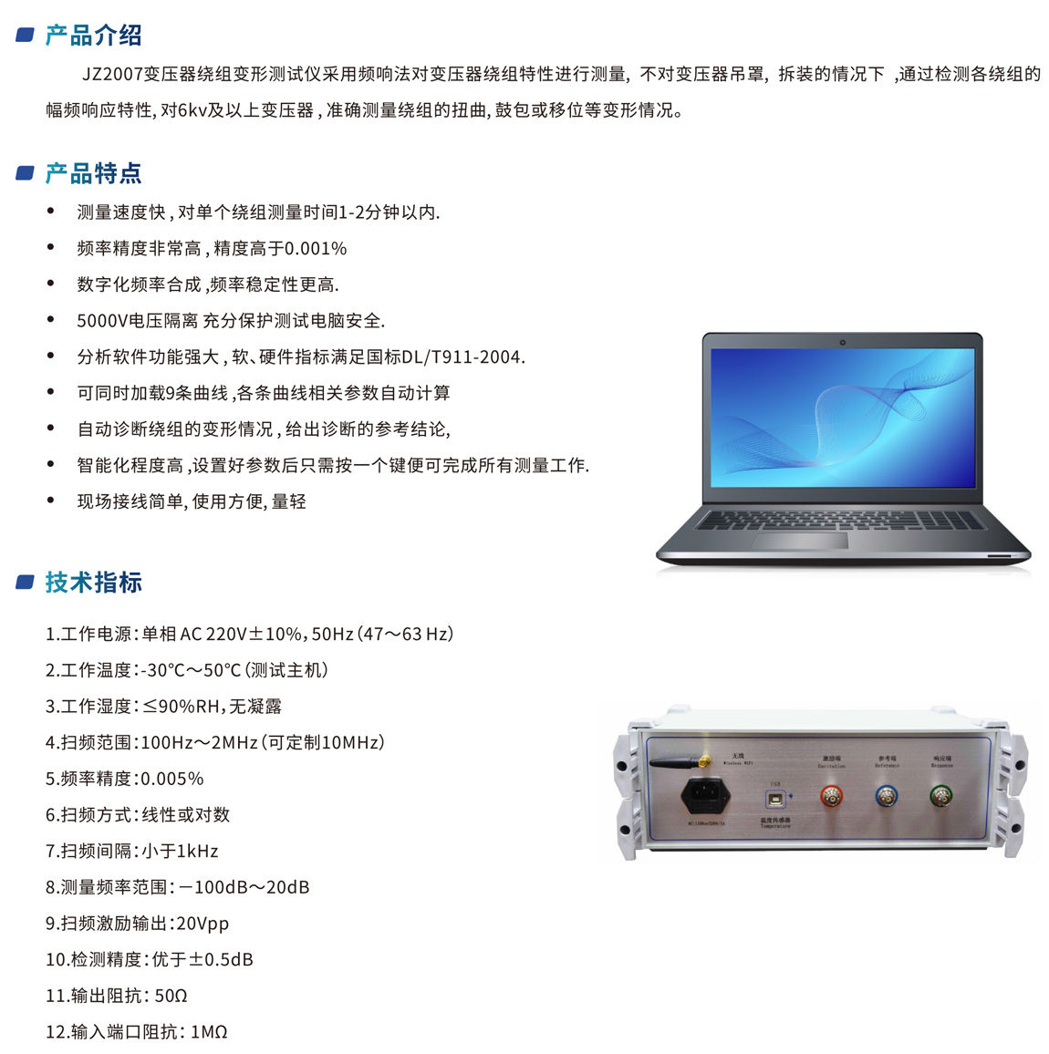 JZ2007變壓器繞組變形測試儀采用頻響法對變壓器繞組特性進行測量,不對變壓器吊罩,拆裝的情況下,通過檢測各繞組的 幅頻響應特性,對6kV及以上變壓器,準確測量繞組的扭曲,鼓包或移位等變形情況。