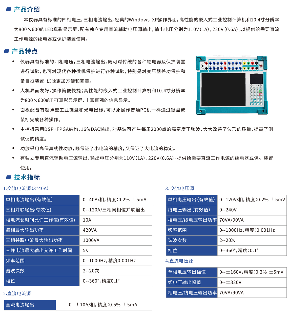 本儀器具有標準的四相電壓,三相電流輸出,經典的Windows XP:操作界面,高性能的嵌入式工業控制計算機和10.4寸分辨率 為800×600的LED真彩顯示屏,配有獨立專用直流輔助電壓源輸出,輸出電壓分別為110V(1A),220V(0.6A)。以提供給需要直流 工作電源的繼電器或保護裝置使用。