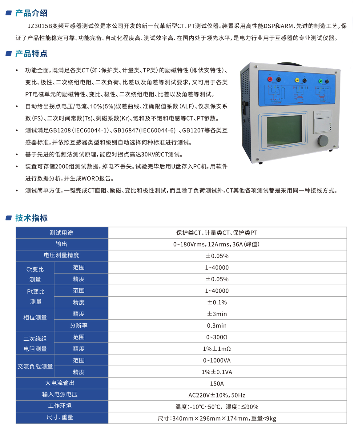 JZ3015B變頻互感器測試儀是本公司開發(fā)的新一代革新型CT、PT測試儀器。裝置采用高性能DSP和ARM、先進(jìn)的制造工藝,保 證了產(chǎn)品性能穩(wěn)定可靠、功能完備、自動化程度高、測試效率高、在國內(nèi)處于領(lǐng)先水平,是電力行業(yè)用于互感器的專業(yè)測試儀器。