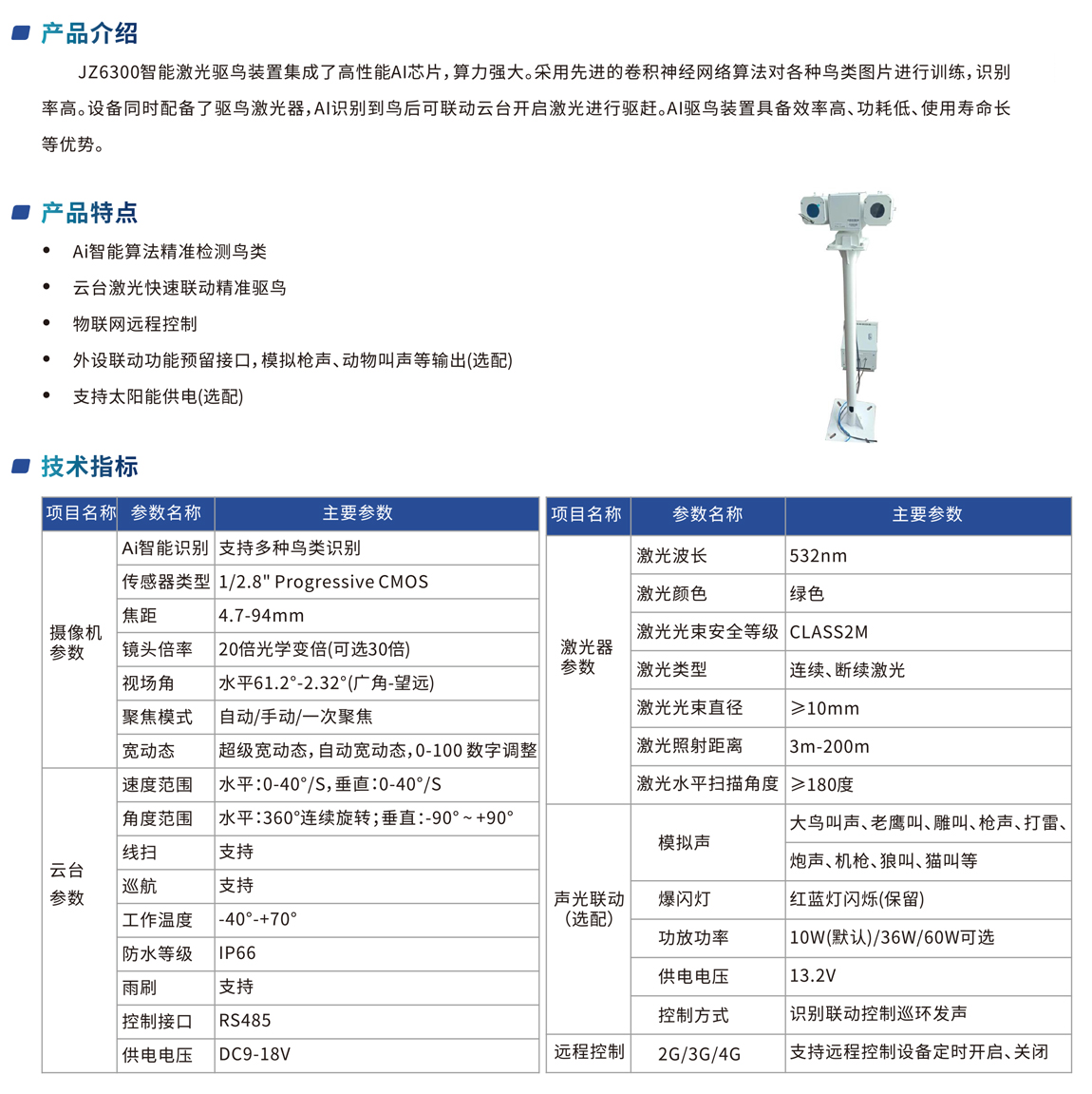 JZ6300智能激光驅(qū)鳥裝置集成了高性能A芯片,算力強(qiáng)大。朵用先進(jìn)的卷積神經(jīng)網(wǎng)絡(luò)算法對(duì)各種鳥類圖片進(jìn)行訓(xùn)練,識(shí)別