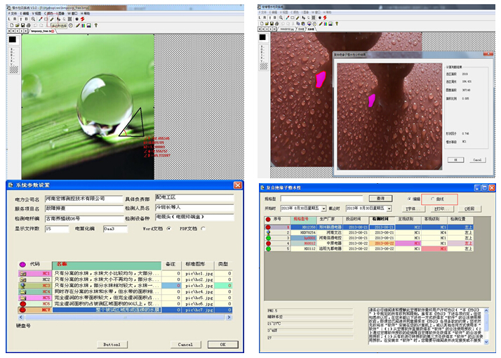 憎水等級(jí)判斷分為兩部分:主觀判斷和客觀判斷。用戶還可以利用“查詢”功能,對(duì)歷史判斷記錄進(jìn)行檢索、查詢和統(tǒng)計(jì)分析。